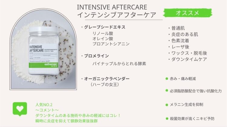 鎮静効果抜群の為、レーザー治療・ワックス・脱毛など赤みが出るような施術後のダウンタイムケアとしてもおすすめ。